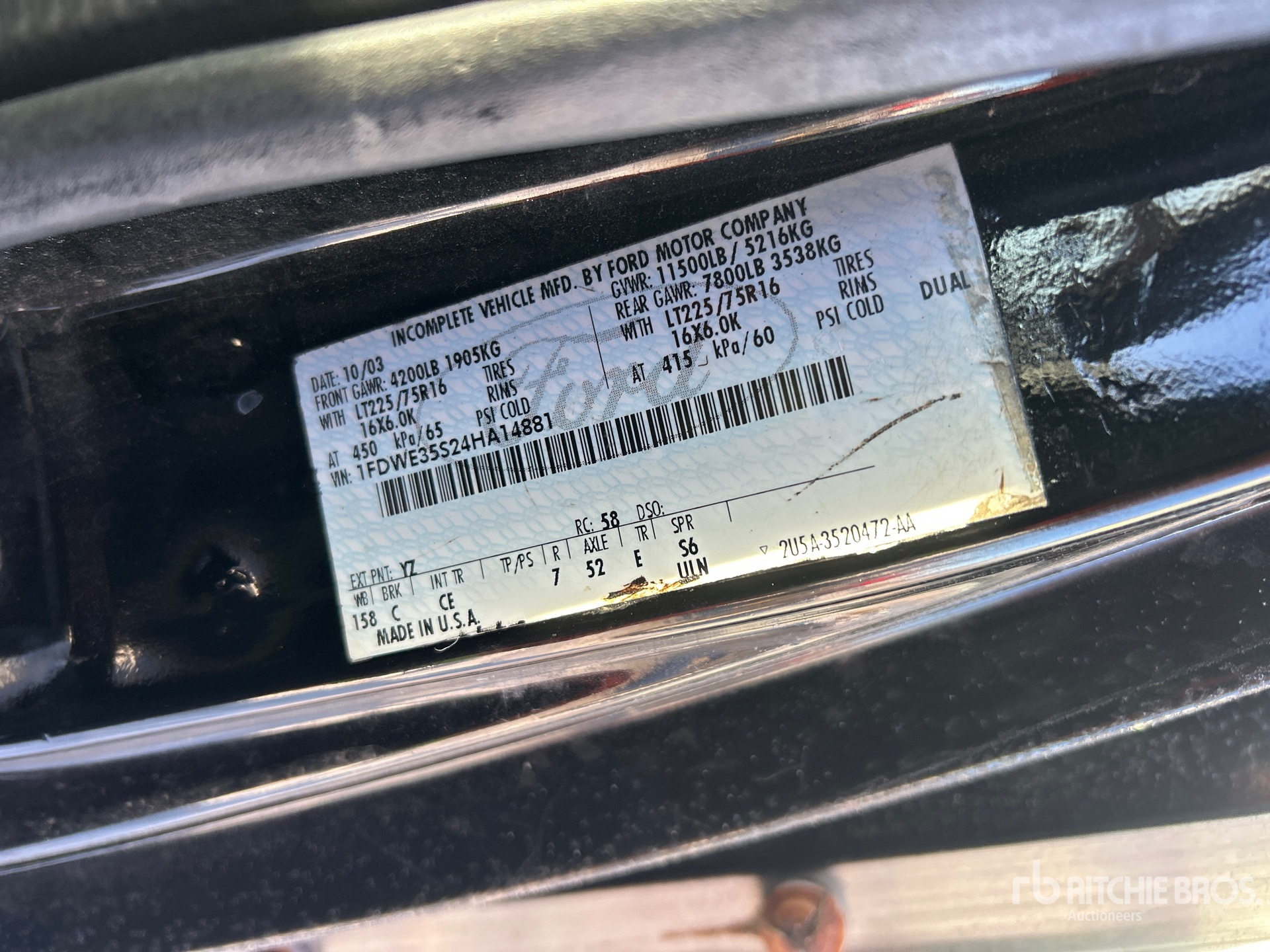 Ford V8 6.8 L Gasoline Engine, 2004 US EPA Label, Automatic Transmission, 4200 lb Front Axle, 7800 lb Rears, 11500 lb GVWR, 225/75R16, Spring Suspension, 158 in Wheelbase, Morgan 15 ft x 96 in Wide x 85 in High Body, Walk-Up Ramp