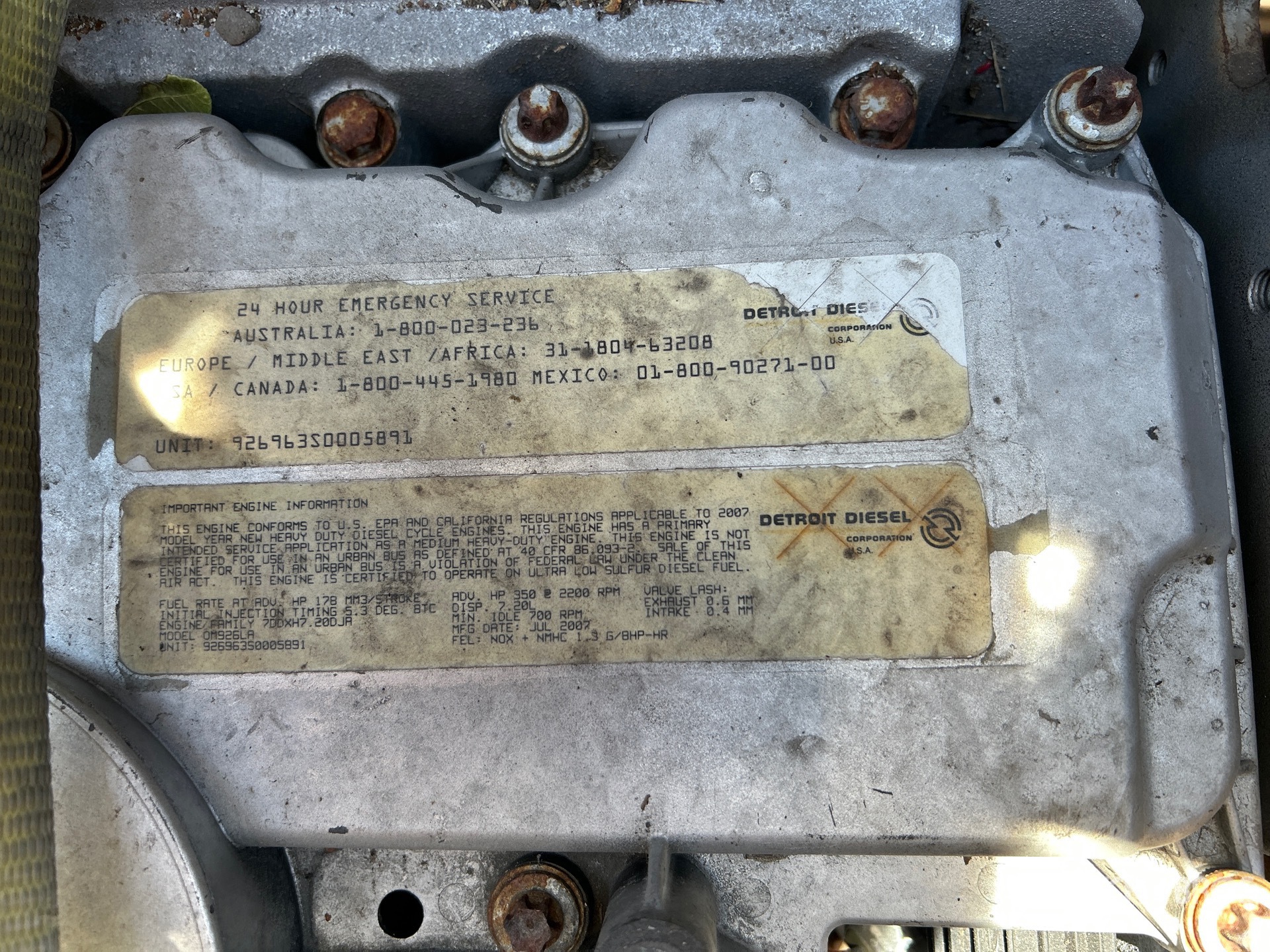 2007 US EPA Label, CARB Compliant, 6 Cylinder 350 hp 7.2 L Diesel Engine, <br><br>***Includes pictured transmission***