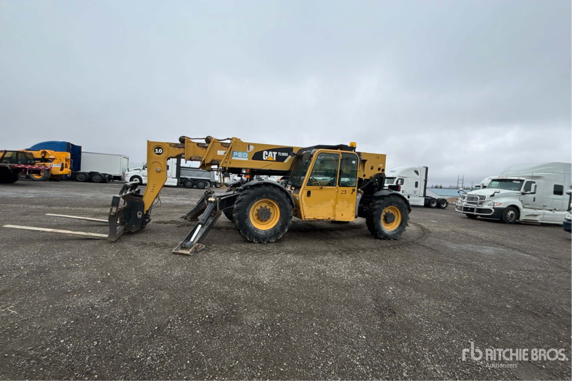 Enclosed Cab, 55 ft Max Lift Height, 10000 lb Max Lift Capacity, 60 in Forks, Hydraulic Coupler, Outriggers, Frame Leveling, 14.00-24 Tires