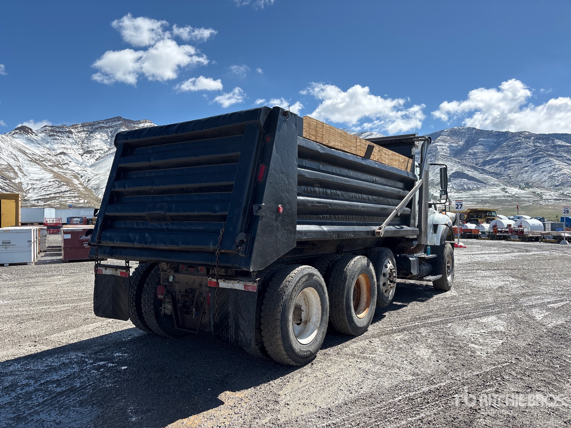 Located in Lane 11 Spot 2, 6 Cylinder Diesel Engine, Allison Automated Transmission, 18000 lb Front Axle, 40000 lb Rears, 58000 lb GVWR, Aluminum Wheels, 315/80R22.5 Front Tires, 11R22.5 Rear Tires, Air Lift Pusher Axle, Air Ride Suspension, 520 in Wheelbase, PTO, 17 ft Long x 74 in High Steel Body, Electric Roll Tarp, High-Lift Tailgate