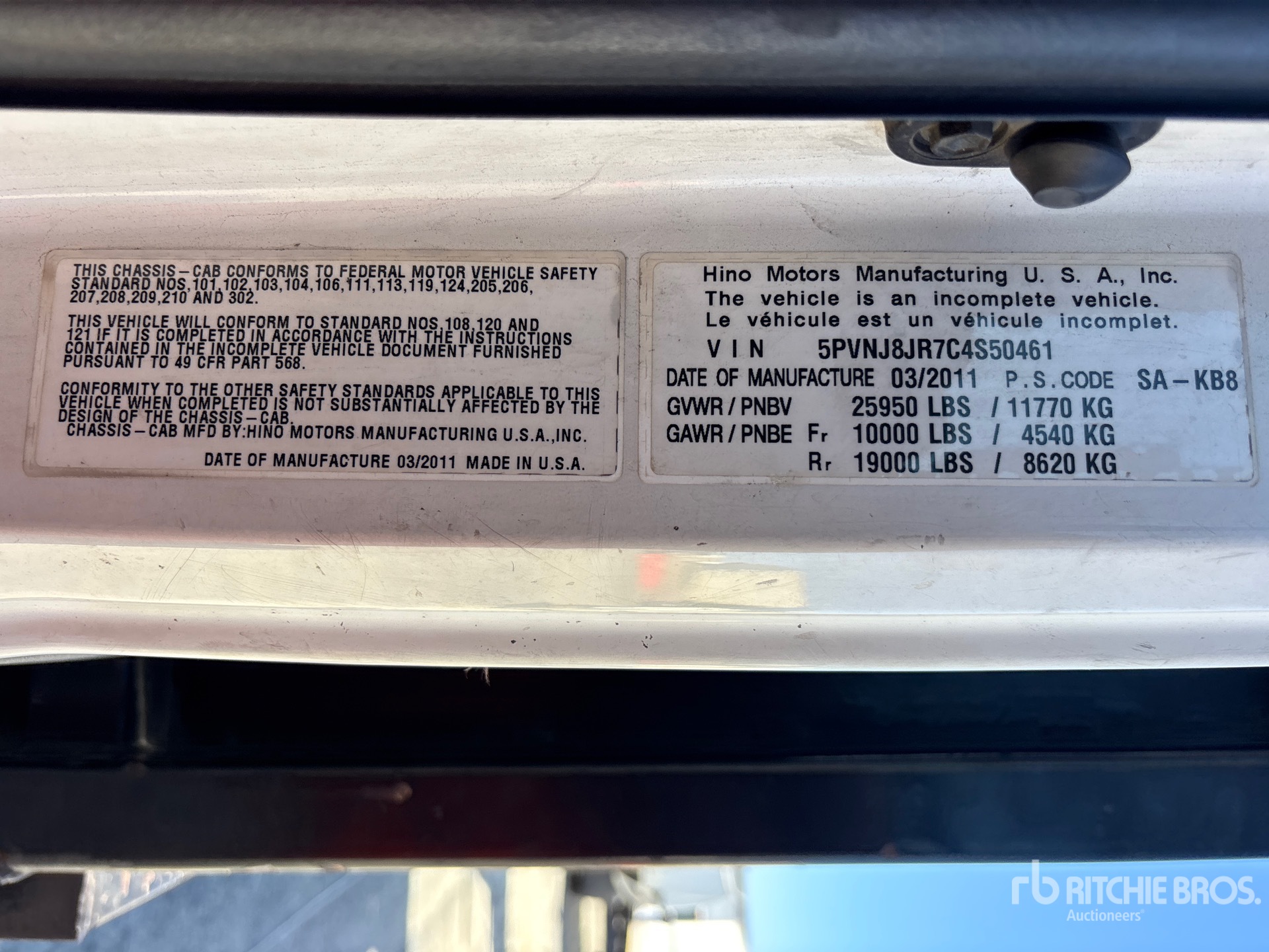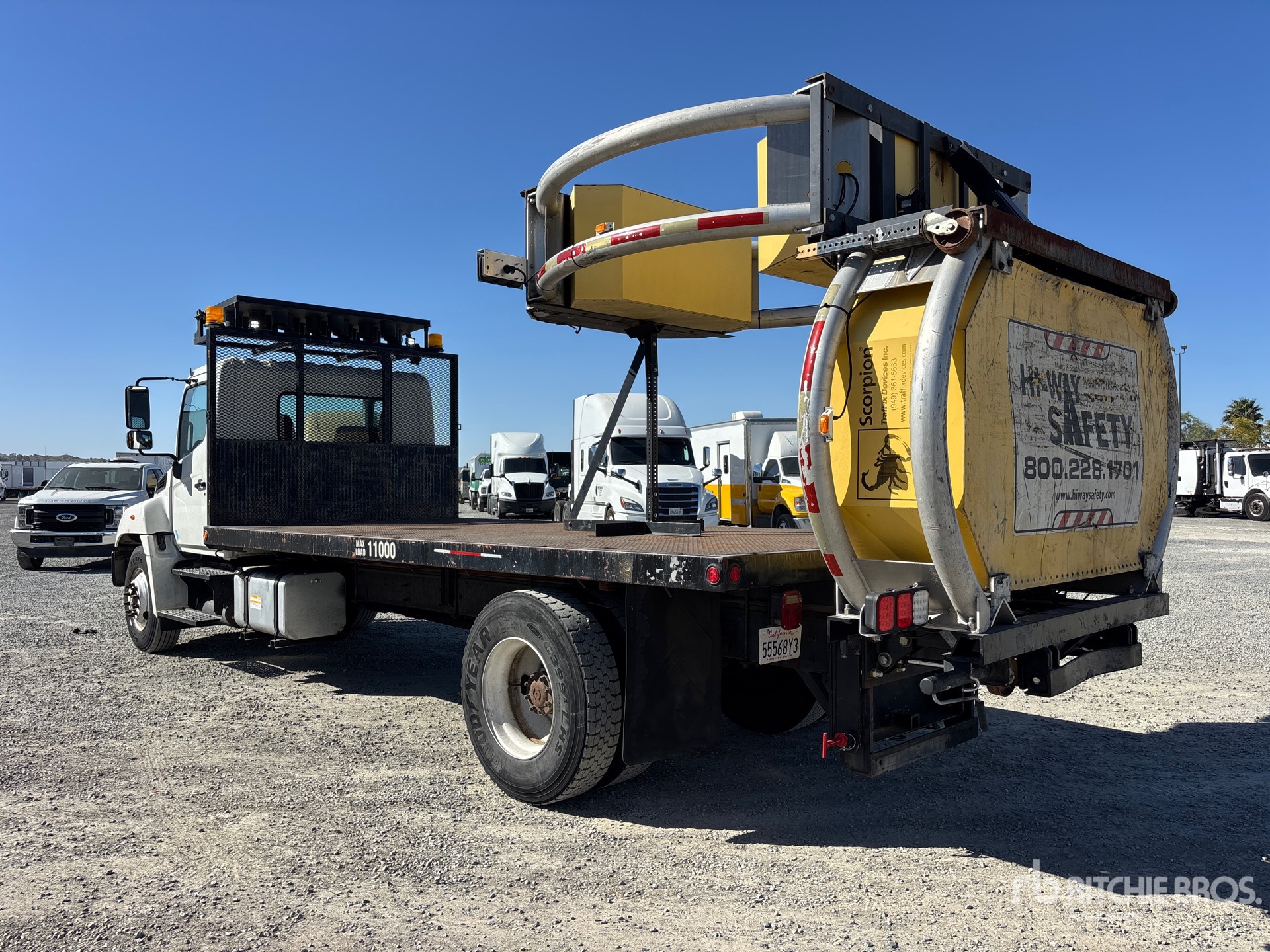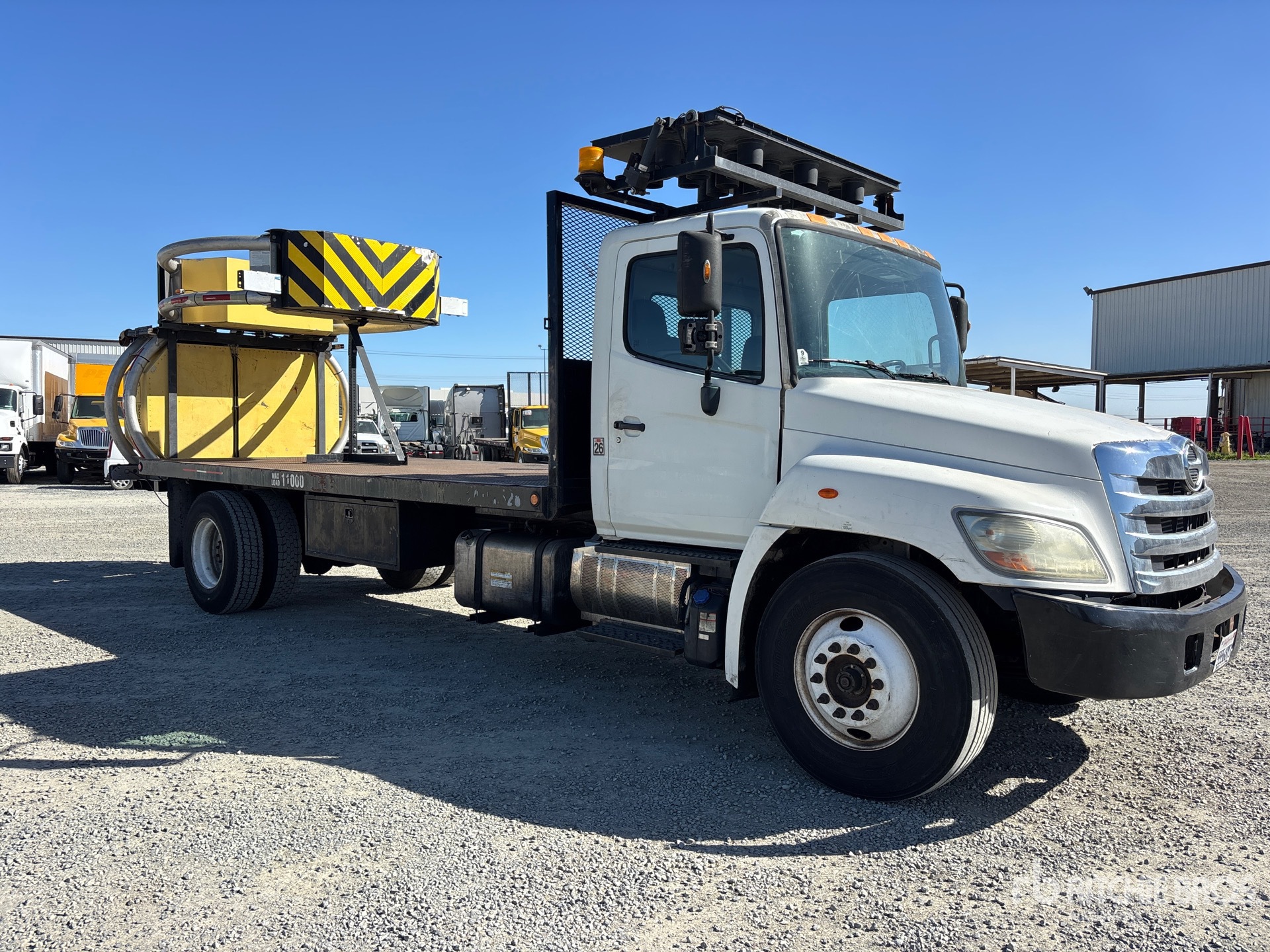 Hino 6 Cylinder 469 cid Diesel 220 hp Engine, 2011 US EPA Label, Requires Diesel Exhaust Fluid, Automatic Transmission, 10000 lb Front Axle, 19000 lb Rears, 25950 lb GVWR, 11R22.5 Front Tires, 11R22.5 Rear Tires, Spring Suspension, 235 in Wheelbase, Flatbed, In-Cab Attenuator Controller