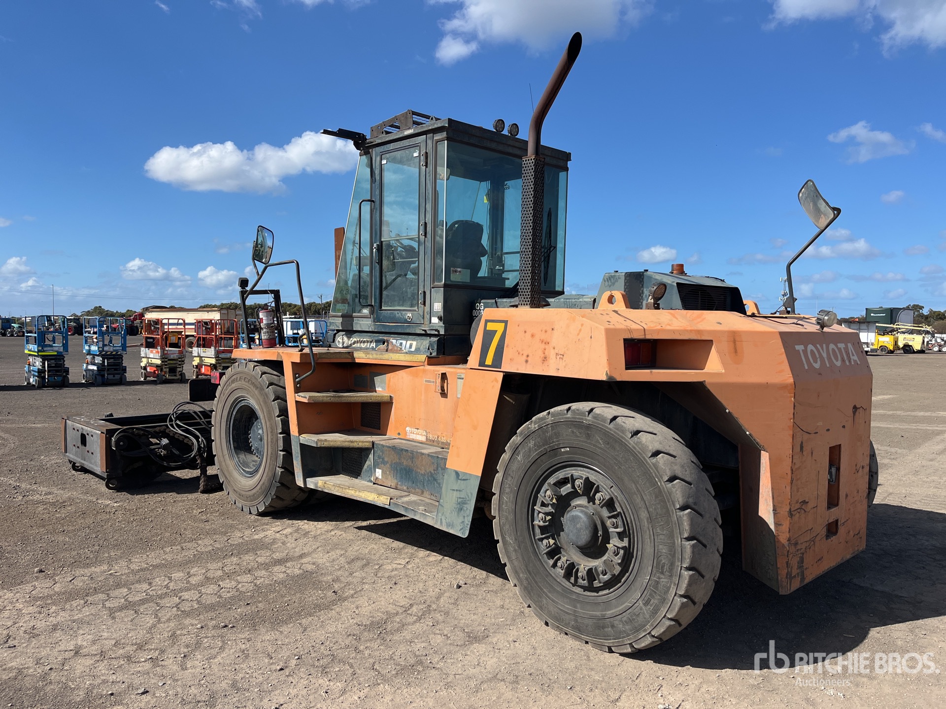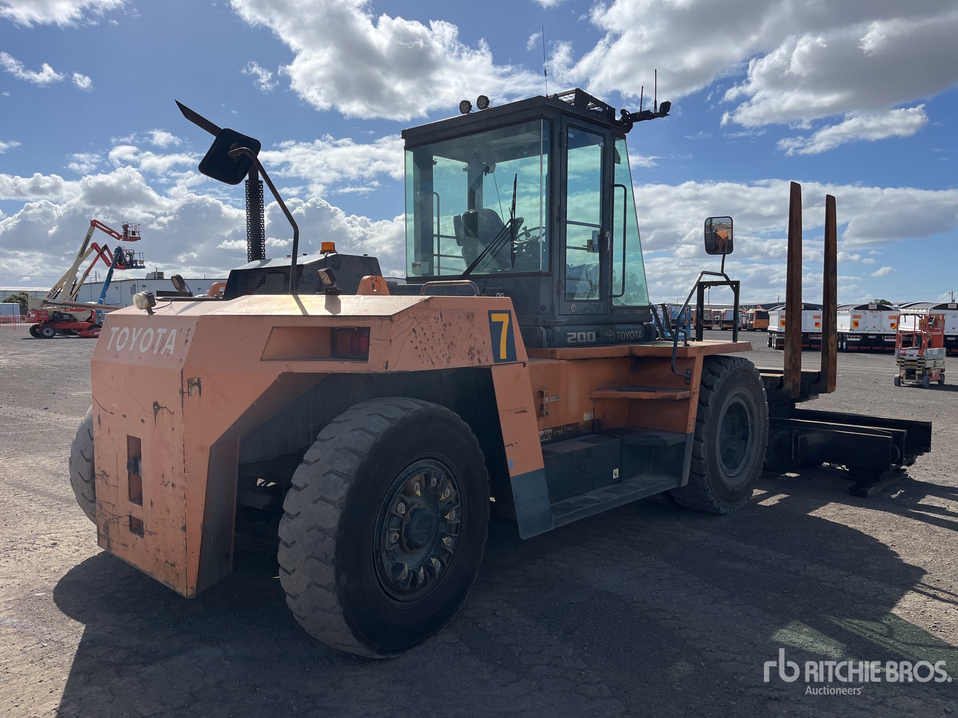 Enclosed Cab, Air Conditioner, 2 Stage Mast, 5000 mm Max Lift Height, 4500 mm Lowered Mast Height, 2100 mm Forks, Side Shift, Fork Positioner, Solid Pneumatic Tires, Hino 6 Cylinder Diesel Engine