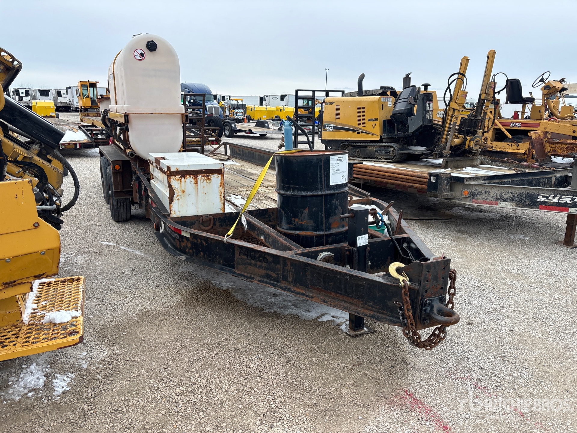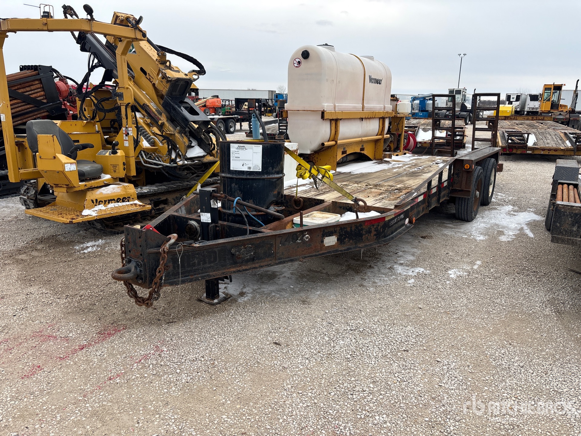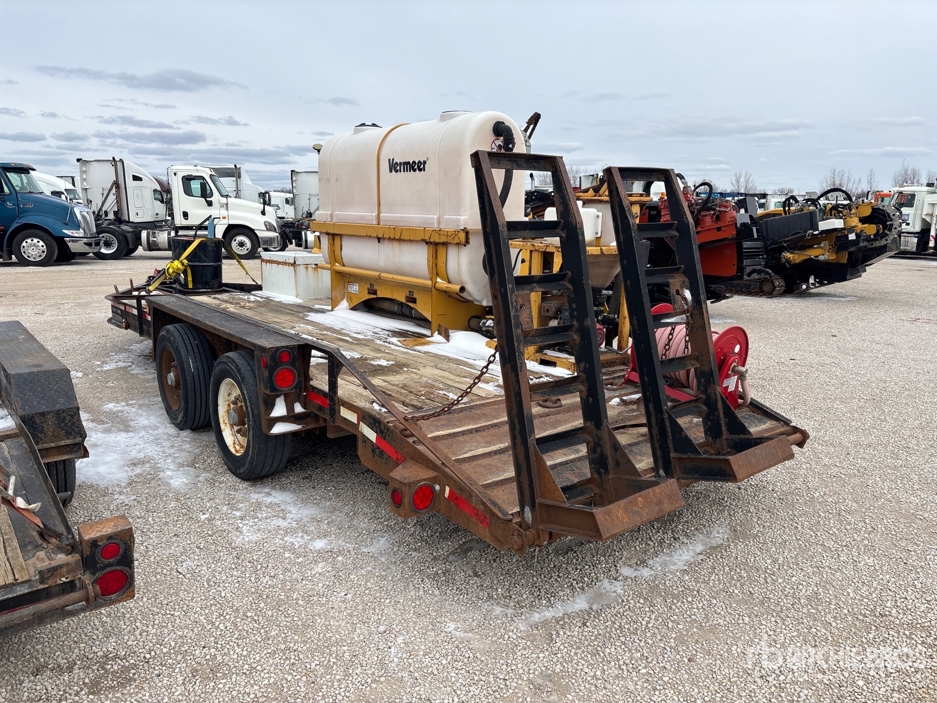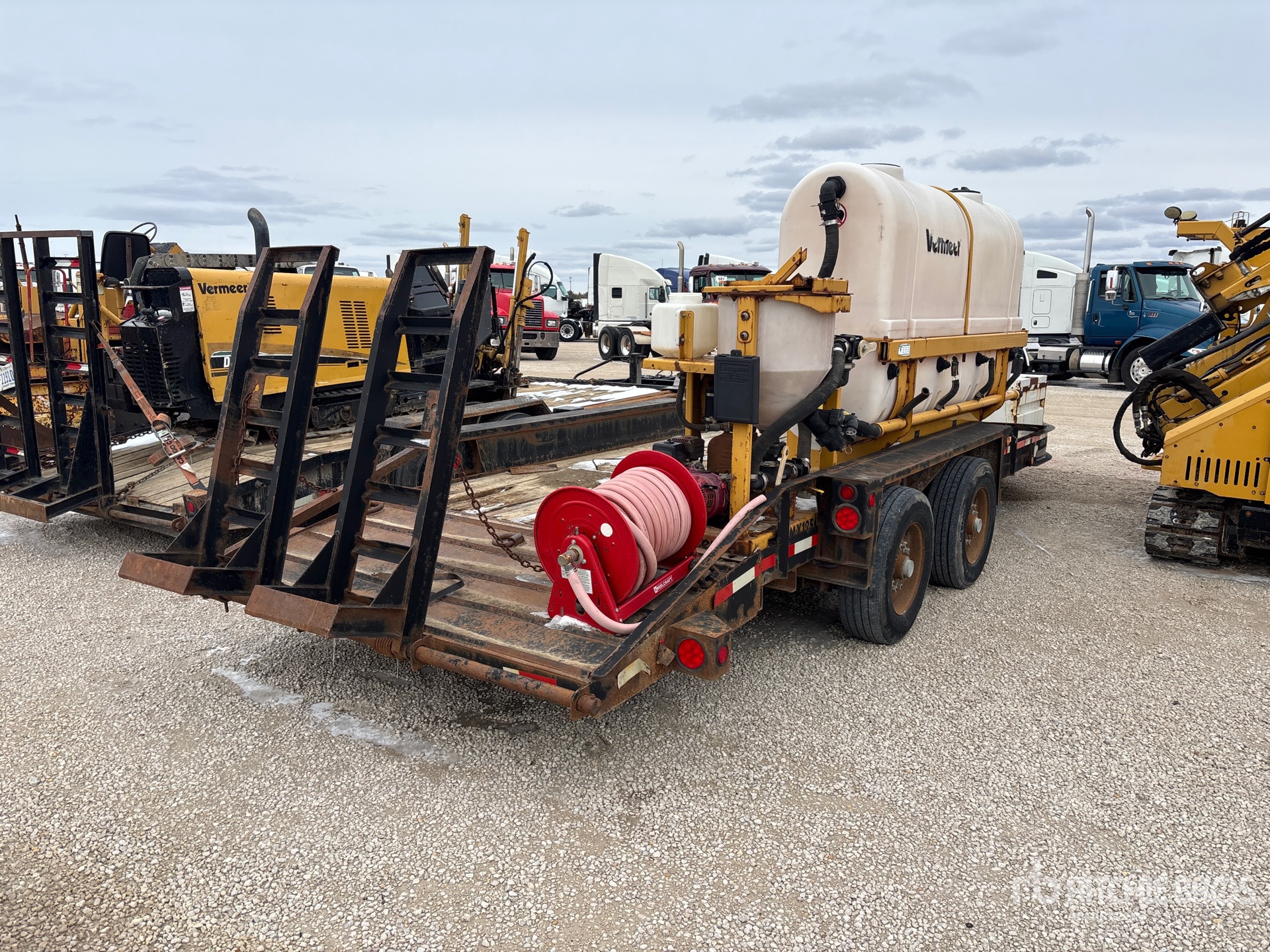 Located in Lane 21 Spot 39, Lunette Ring Hitch, Spring Suspension, Electric Brakes, 17 ft Main Deck, 5 ft 2-Position Dovetail, 84 in Usable Deck Width, 86 in Overall Deck Width, Storage Compartments, Deck Over Tires, Manual Ramps, Wood Flooring, 235/75R17.5 Tires, 23000 lb GVWR, Vermeer Mud Mixing System
