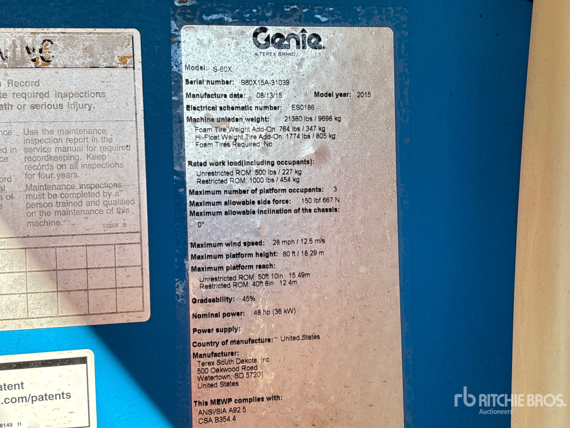 60 ft Max Platform Height, 1000 lb Max Weight Capacity, Power to Platform, Onboard Generator, 2015 US EPA Label, CARB Compliant, Deutz D2.9L4 4 Cylinder 36.4 kW 2.9 L Diesel Engine, 355/55D625 Foam-Filled Tires