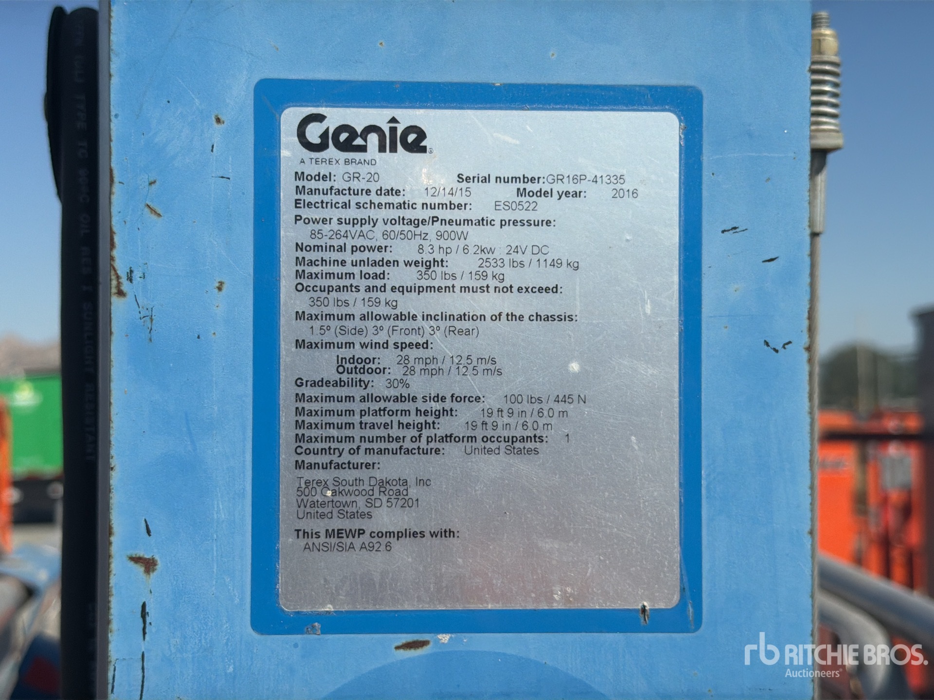 詳細的設備資訊範圍有限,利氏兄弟拍賣行並未檢驗除此處明確規定以外的任何設備部分或組件。除非明確說明,否則我們對設備或其組件不做任何明示或暗示的陳述或保證,包括但不限於有關功能性、符合性或遵守任何適用當局或監管機構的任何安全標準或要求、適合任何特定用途或適銷性的陳述或保證。強烈建議您在投標前自行詳細檢驗設備。