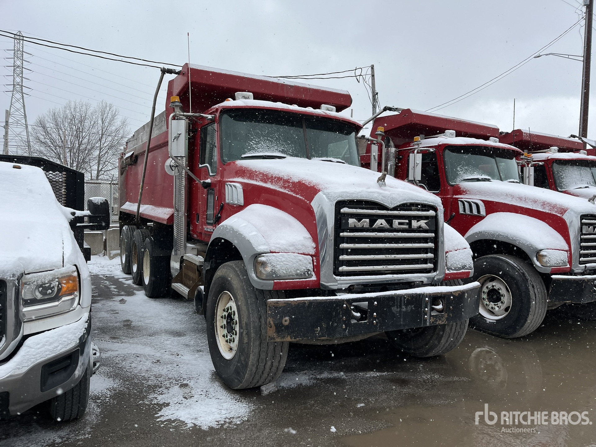 Mack MP7 10.8 L Diesel 395 hp Engine, 18884 Engine hrs, Engine Brake, Mack MAXITORQUE ES 8-Speed Manual Transmission, Differential Lock, 20000 lb Front Axle, 46000 lb Rears, 425/65R22.5 Front Tires, 11R22.5 Rear Tires, Air Lift Pusher Axle, Air Lift Tag Axle, Dual Steering Boxes, Double Frame, Spring Suspension, 230 in Wheelbase, PTO, Wet Kit, American 16 ft Long Steel Body, 15 cyd, Capacity, Electric Roll Tarp, Rear Hydraulics