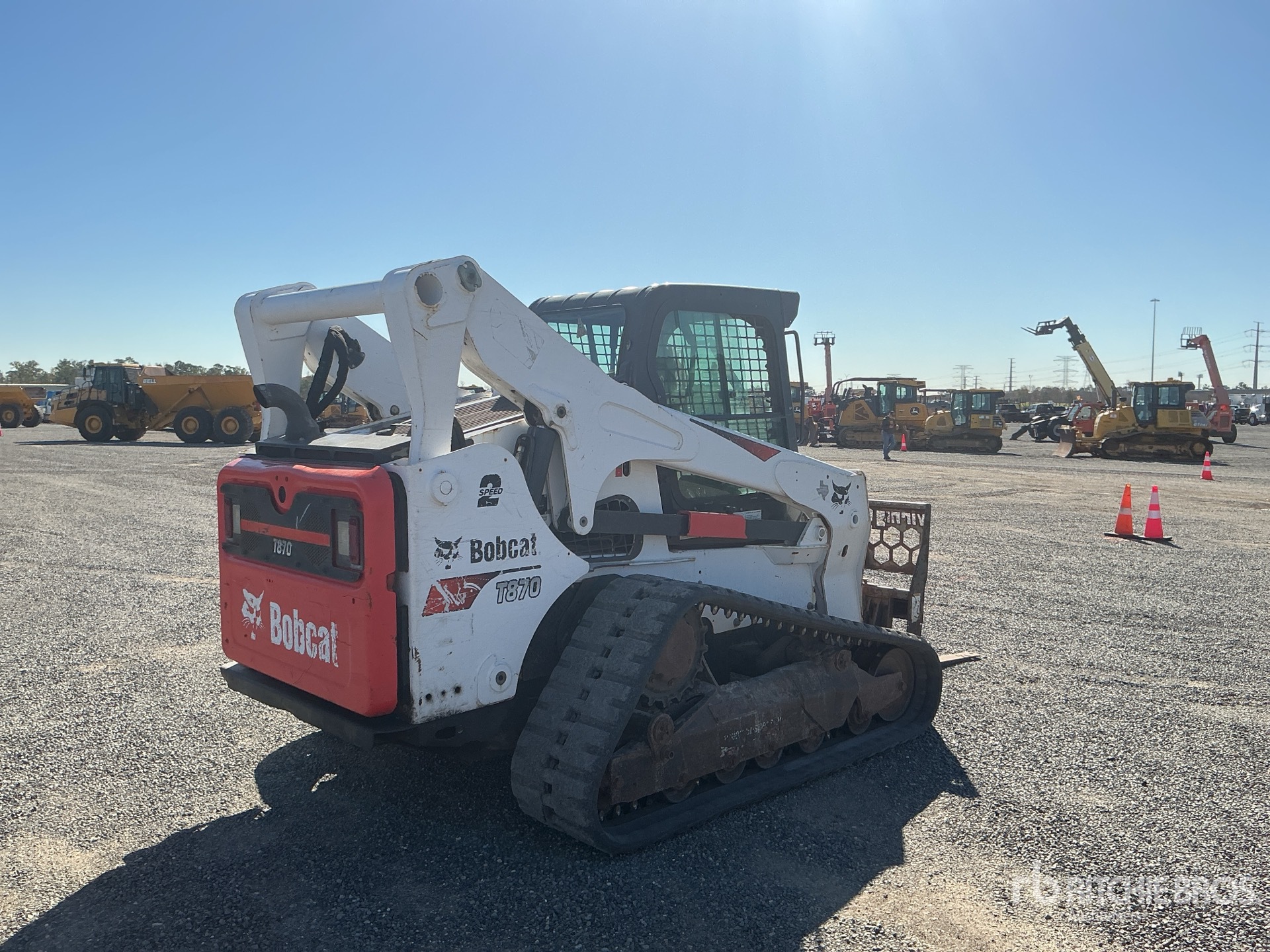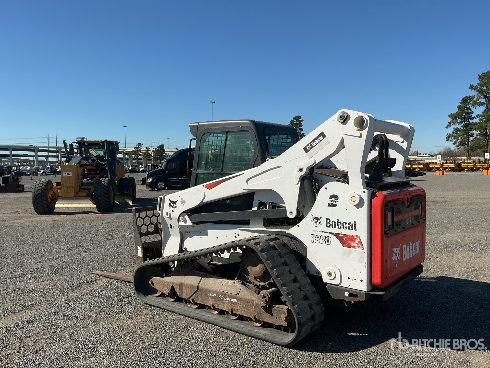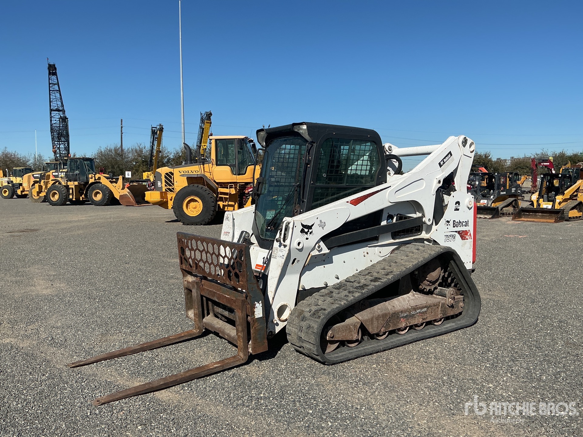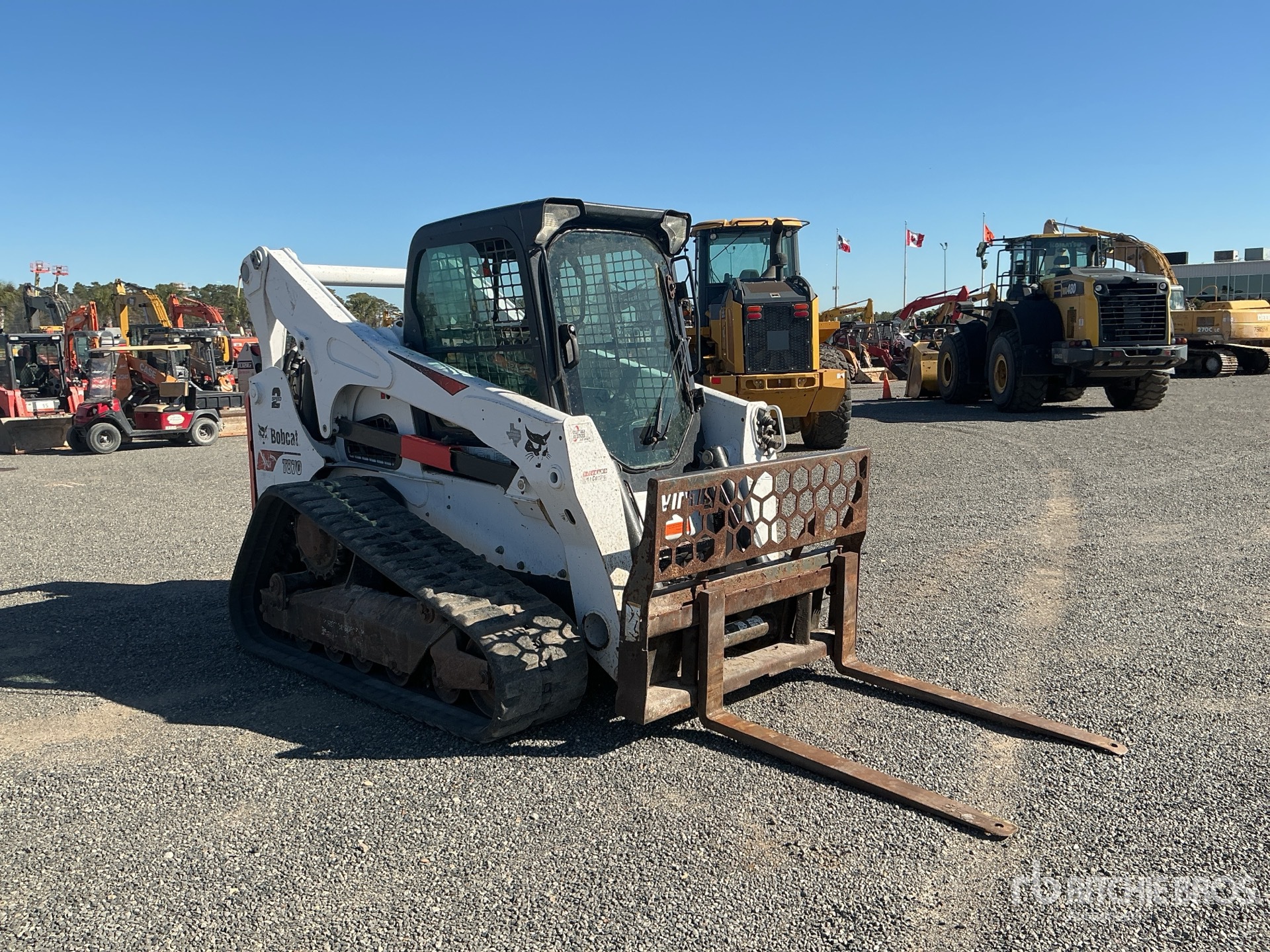 Located in Lane 5 Spot 27, Enclosed Cab, Ride Control, Joystick Steering, Control Pattern Changer, 17 in Track Belts, 7 Pin Electric Kit, Hydraulic Coupler, Forks