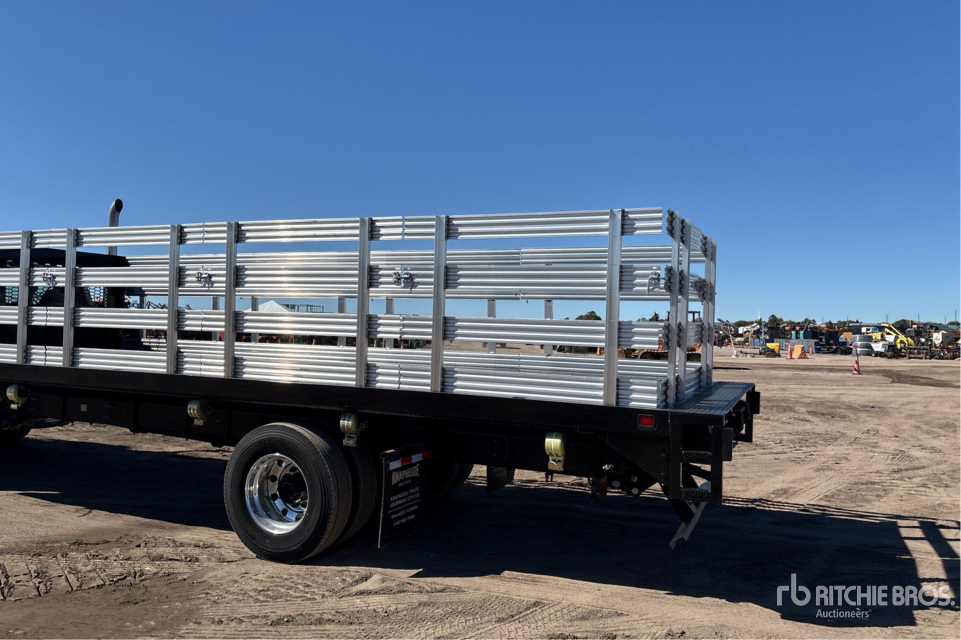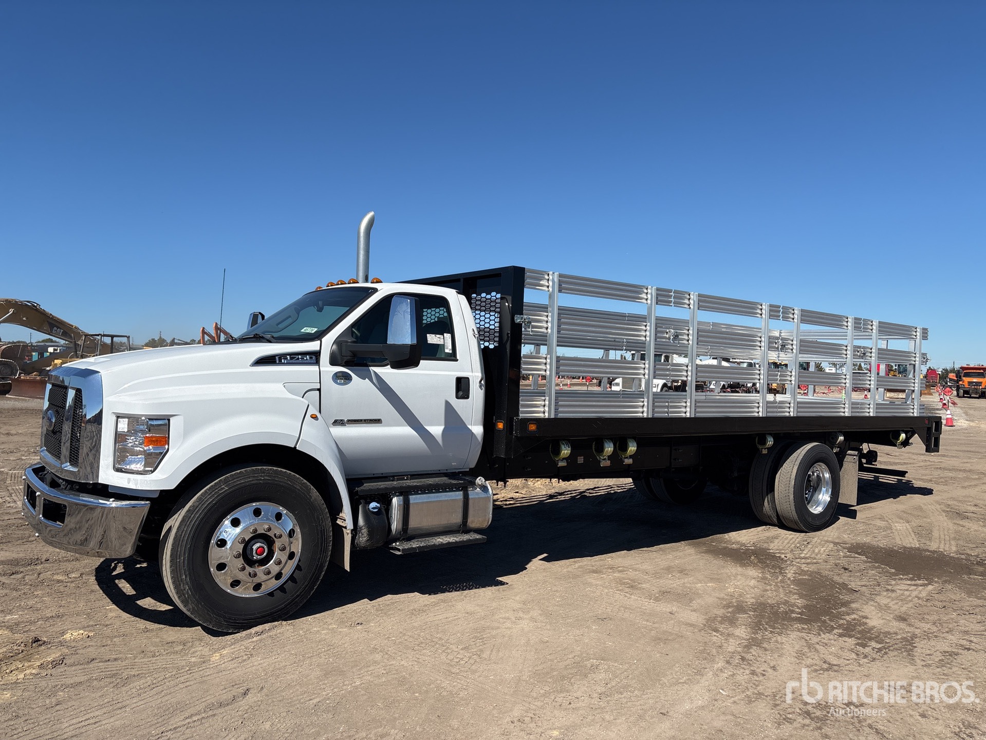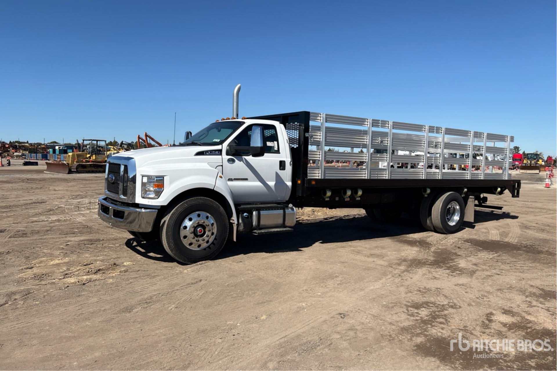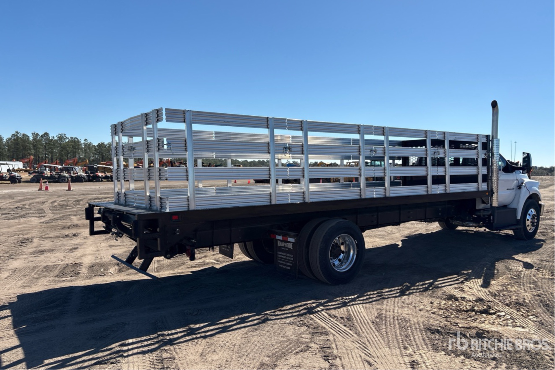 Located in Lane 52 Spot 22, Ford Power Stroke V8 6.7 L Diesel Engine, 2023 US EPA Label, Requires Diesel Exhaust Fluid, 24 Engine hrs, Automatic Transmission, 12000 lb Front Axle, 21000 lb Rears, 25999 kg GVWR, Aluminum Wheels, 11R22.5, Spring Suspension, 260 in Wheelbase, 25 ft 5 in x 96 in Bed, Liftgate, 48 in Aluminum Stake Sides