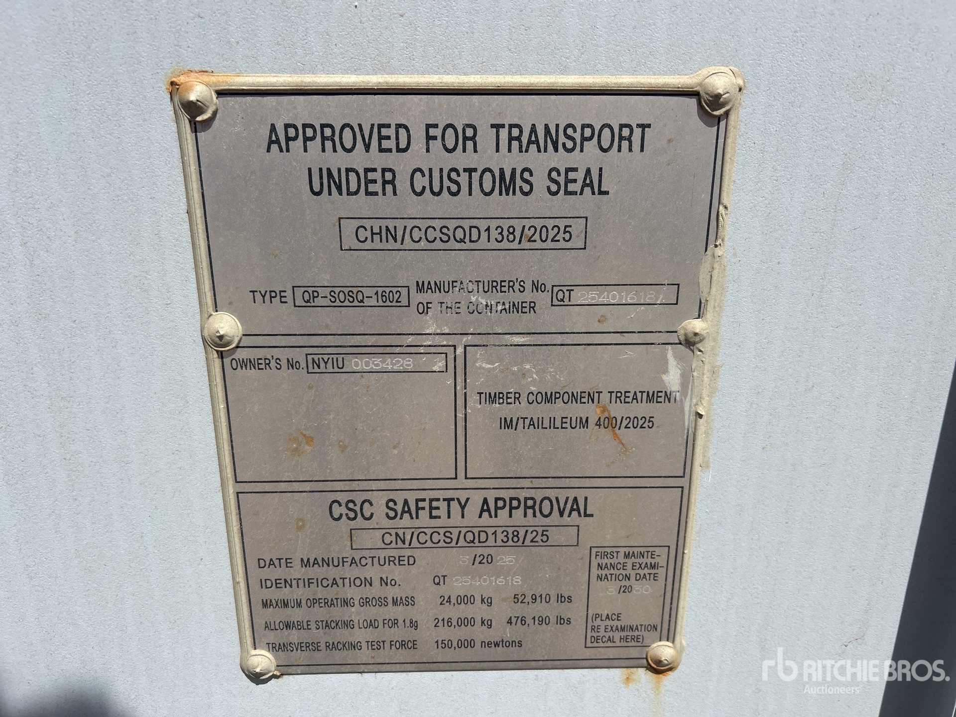 測量值僅供估計。實際負載尺寸可能會因卡車 / 拖車高度及負載機器配置 / 位置而異。買家有責任在離開我們的拍賣現場前測量所有負載,以確保負載運輸安全。所有測量值都應由買家驗證。請勿依賴這些測量值進行運輸。