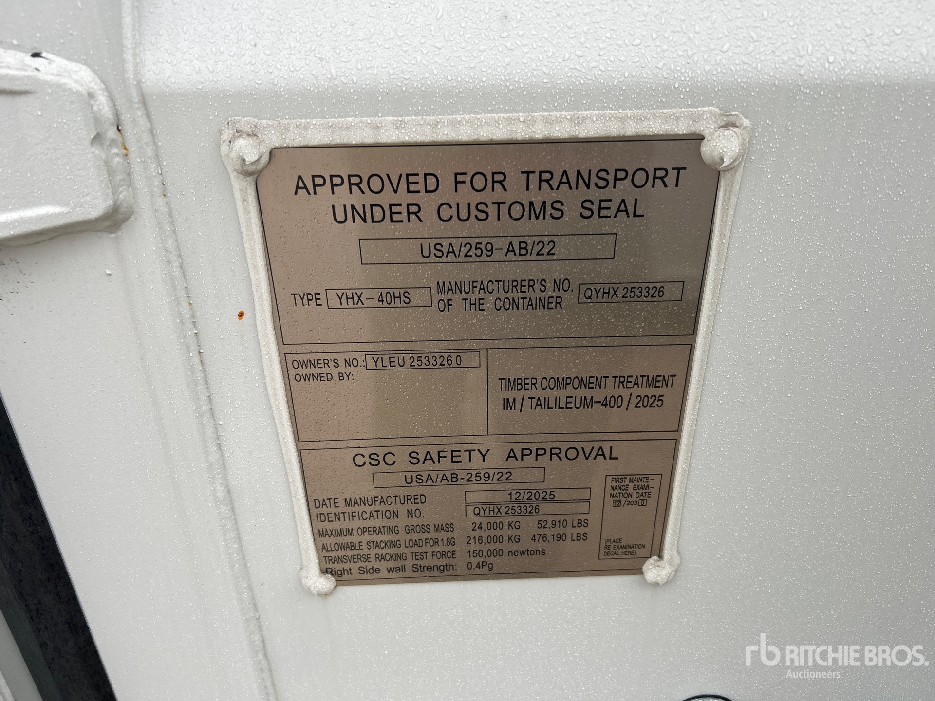 詳細的設備資訊範圍有限,利氏兄弟拍賣行並未檢驗除此處明確規定以外的任何設備部分或組件。除非明確說明,否則我們對設備或其組件不做任何明示或暗示的陳述或保證,包括但不限於有關功能性、符合性或遵守任何適用當局或監管機構的任何安全標準或要求、適合任何特定用途或適銷性的陳述或保證。強烈建議您在投標前自行詳細檢驗設備。