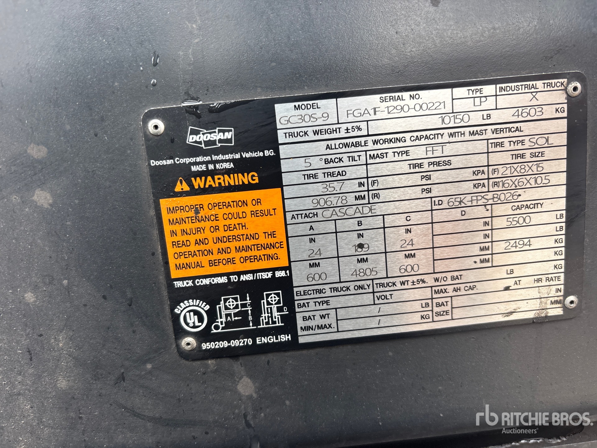 詳細的設備資訊範圍有限,利氏兄弟拍賣行並未檢驗除此處明確規定以外的任何設備部分或組件。除非明確說明,否則我們對設備或其組件不做任何明示或暗示的陳述或保證,包括但不限於有關功能性、符合性或遵守任何適用當局或監管機構的任何安全標準或要求、適合任何特定用途或適銷性的陳述或保證。強烈建議您在投標前自行詳細檢驗設備。