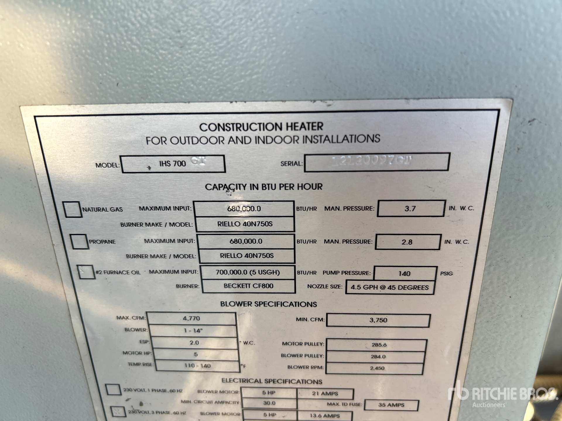 詳細的設備資訊範圍有限,利氏兄弟拍賣行並未檢驗除此處明確規定以外的任何設備部分或組件。除非明確說明,否則我們對設備或其組件不做任何明示或暗示的陳述或保證,包括但不限於有關功能性、符合性或遵守任何適用當局或監管機構的任何安全標準或要求、適合任何特定用途或適銷性的陳述或保證。強烈建議您在投標前自行詳細檢驗設備。