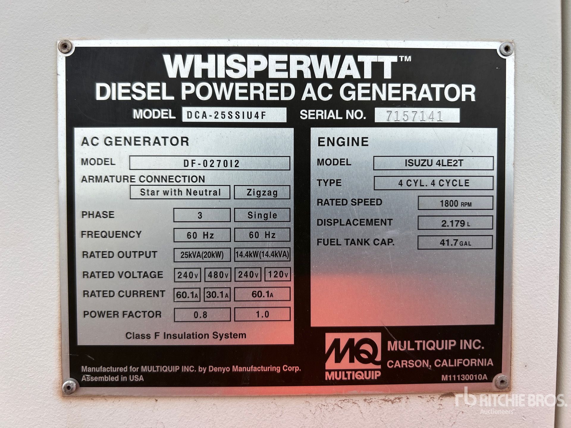 2019 US EPA Label, Isuzu 30 kW 2.18 L Diesel Engine, 25 kVA/20 kW Rated 3 Phase Output, 240 V / 480 V Rated Voltage, 14.4 kVA,/14.4 kW, Rated Single Phase Output, 240 V / 120 V Rated Voltage, 240 V & 120 V Receptacles, Sound Attenuated, Bottom Mounted Fuel Tank
