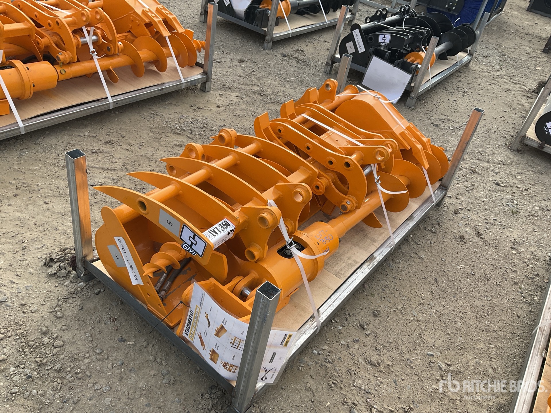 (1) Rake, (1) Ripper, (1) Grapple, (1) Auger w/ 12 in & 16 in Auger Bits, (1) 8 in Narrow Bucket, (1) 24 in Bucket, (1) 32 in Bucket