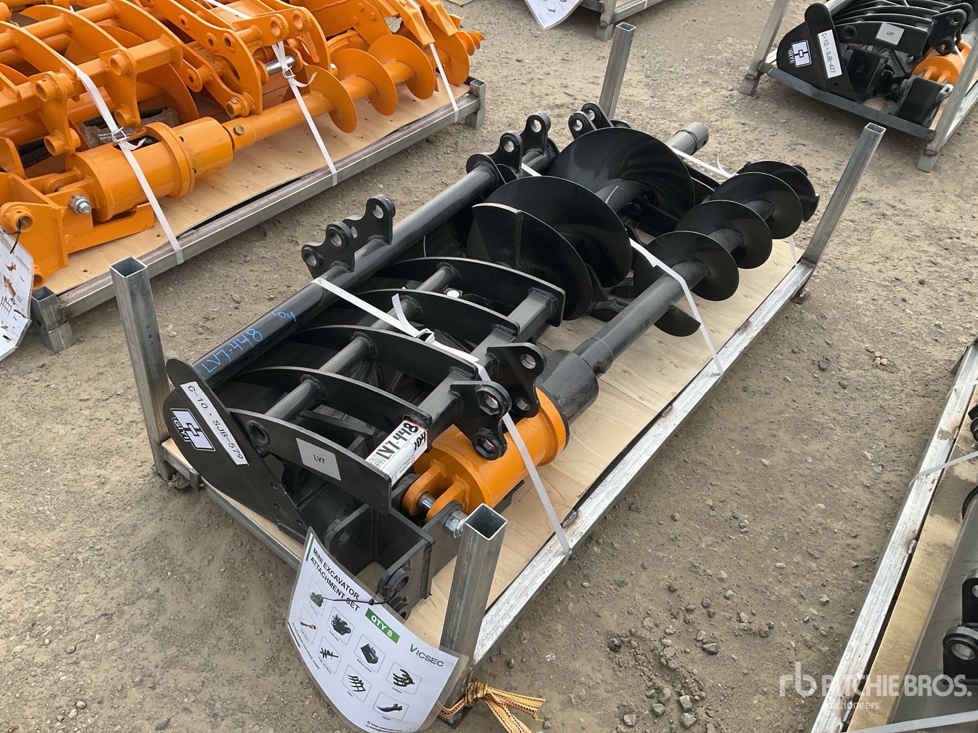 (1) Rake, (1) Ripper, (1) Grapple, (1) Auger w/ 12 in & 16 in Auger Bits, (1) 8 in Narrow Bucket, (1) 24 in Bucket, (1) 32 in Bucket