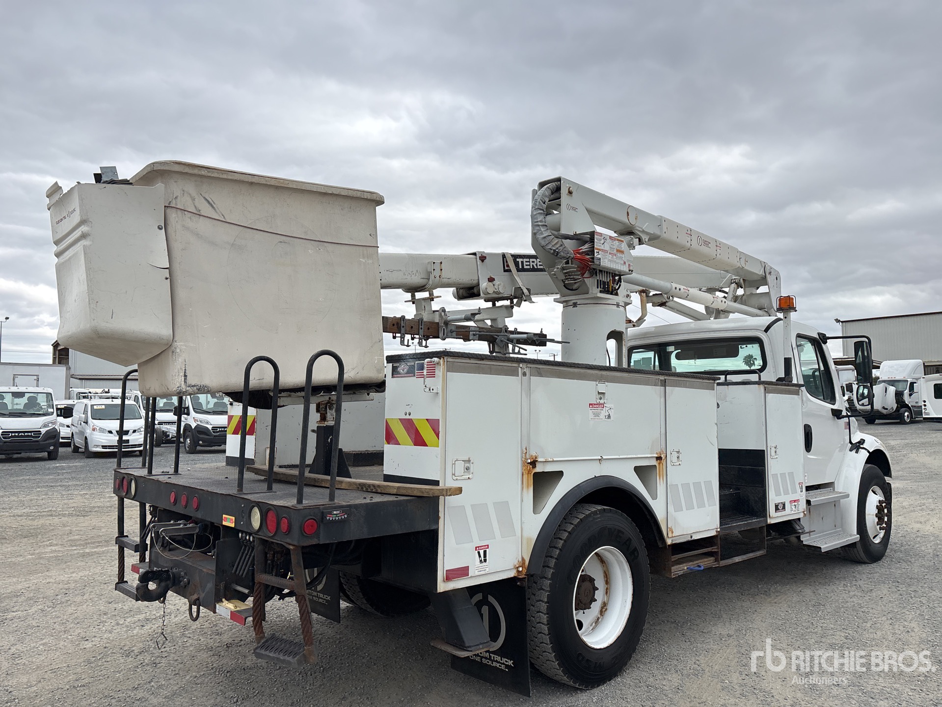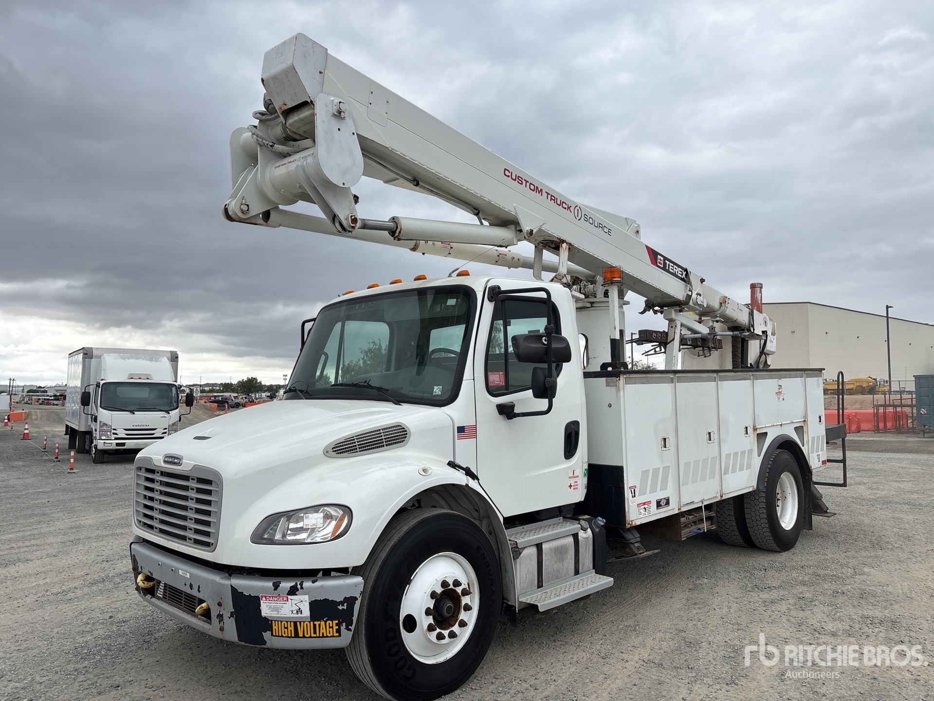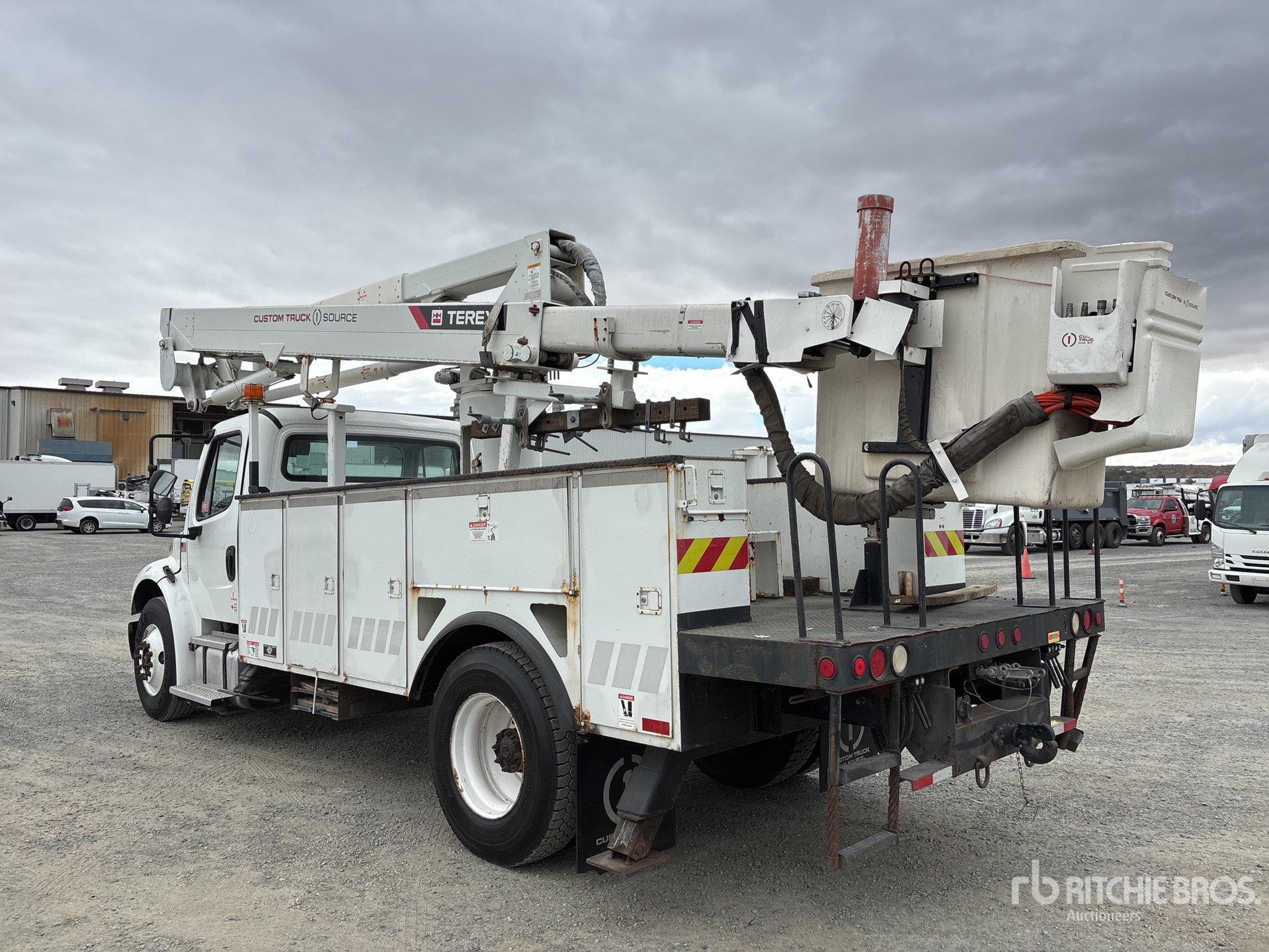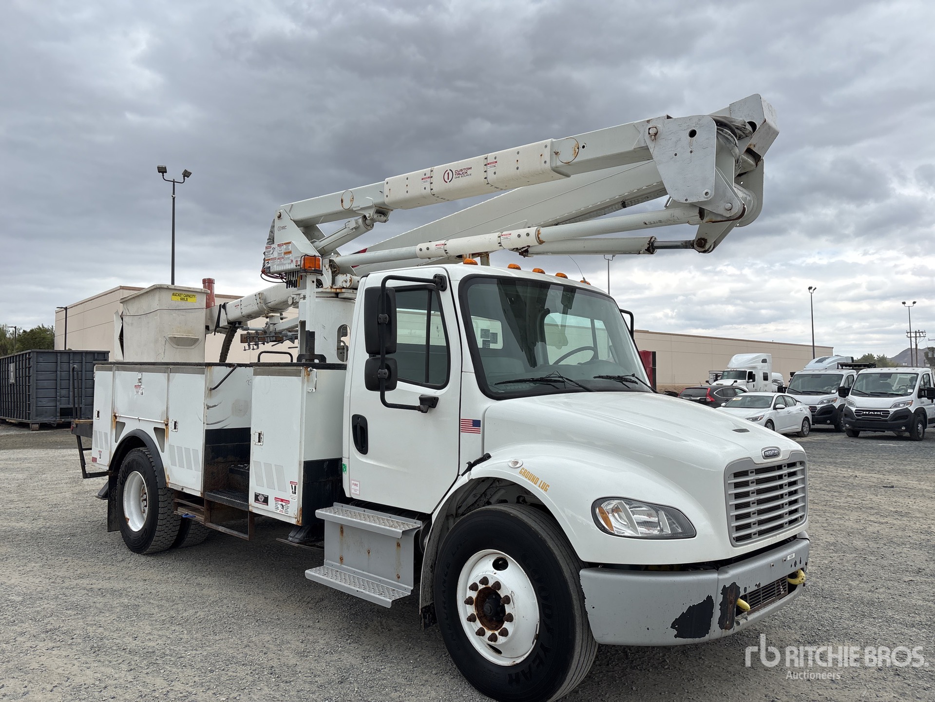 Cummins ISB 6 Cylinder 6.7 L Diesel 250 hp Engine, 2014 US EPA Label, Requires Diesel Exhaust Fluid, 5459 Engine hrs, Allison 3500 Automatic Transmission, 13220 lb Front Axle, 21000 lb Rears, Meritor Ms-21-14X Drive Axles, 6.43:1 Axle Ratio, 33000 lb GVWR, 11R22.5, Spring Suspension, 189 in Wheelbase, PTO, 600 lb Capacity, Center Mounted, One-Person Articulating-Telescopic Boom, Utility Body, A-Outriggers, 16 ft 6 in x 96 in Bed