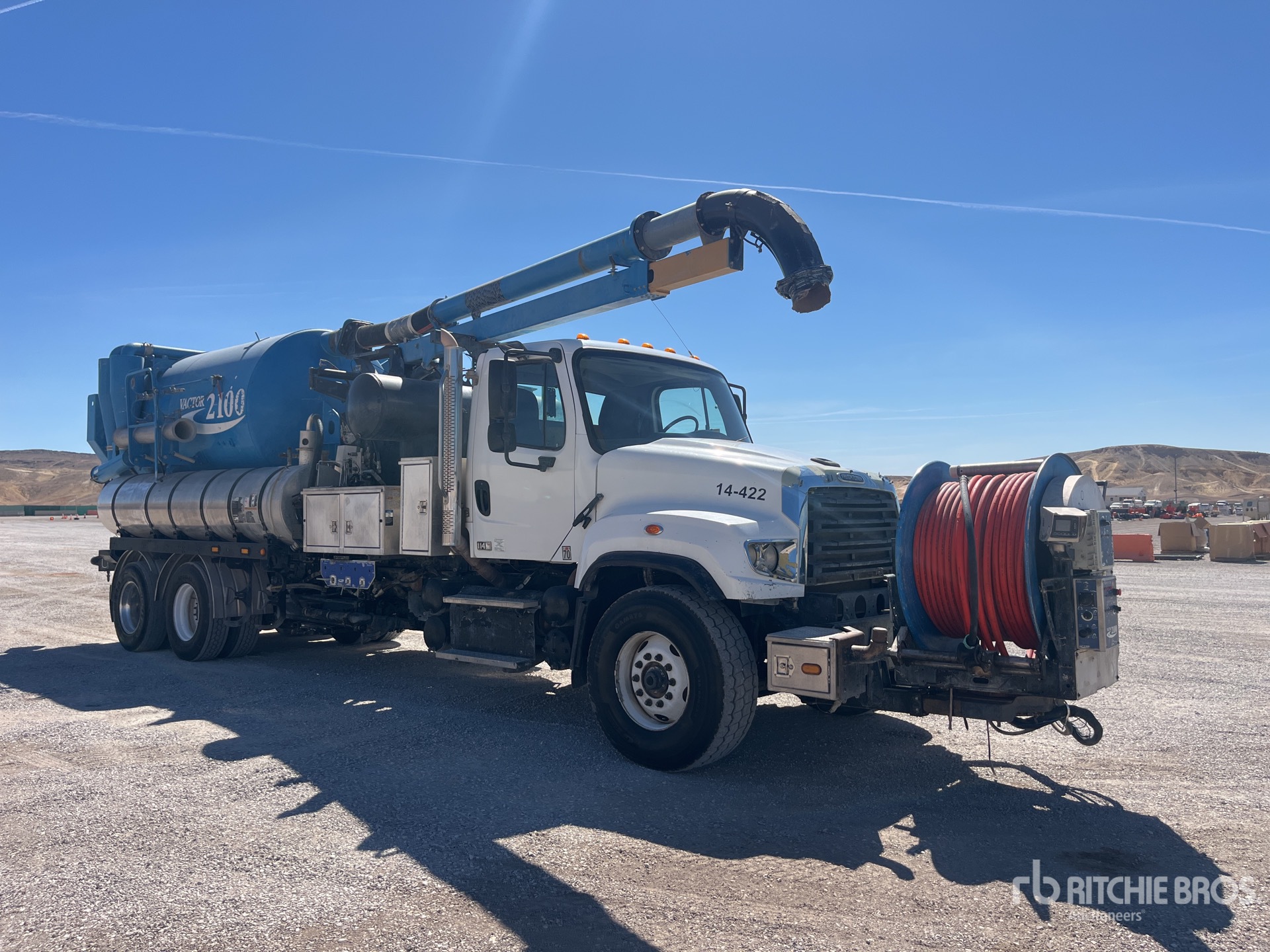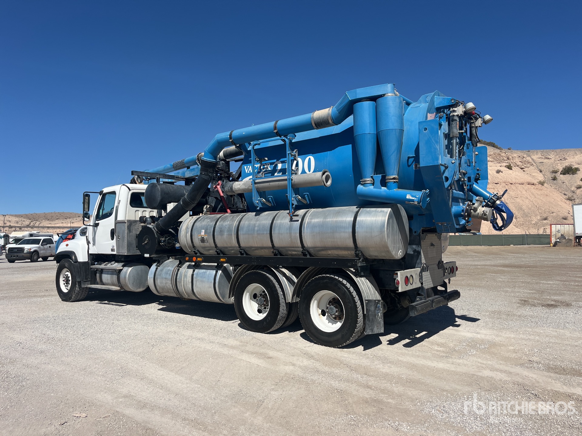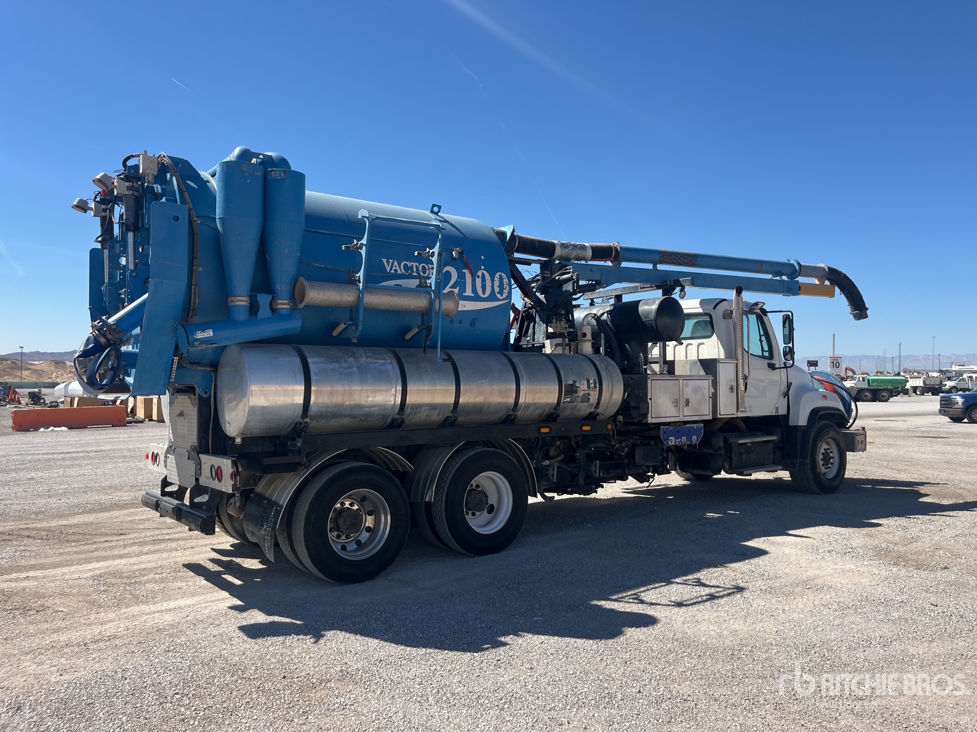 Cummins ISL 6 Cylinder Diesel 370 hp Engine, 2013 US EPA Label, Requires Diesel Exhaust Fluid, 138870 Engine hrs, Allison 3000 Automatic Transmission, 20000 lb Front Axle, 46000 lb Rears, Meritor RT-46-160P Drive Axles, 5.63:1 Axle Ratio, 66000 lb GVWR, 425/65R22.5 Front Tires, 12R22.5 Rear Tires, Double Frame, Hendrickson RT/RTE Series Spring over Walking Beam Suspension, 280 in Wheelbase, Steel 2100 gal Debris Tank, Front Hose Reel, 1250 gal Fresh Water Tank, Hydraulic Lift Tailgate, Hydraulic Tailgate Locks, 15 ft Telescopic Boom, 8 in Suction Hose, Blower